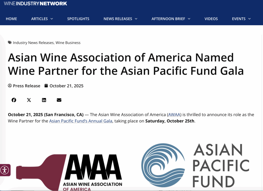 The Asian Wine Association of America (AWAA) is thrilled to announce its role as the Wine Partner for the Asian Pacific Fund’s Annual Gala, taking place on Saturday, October 25th.