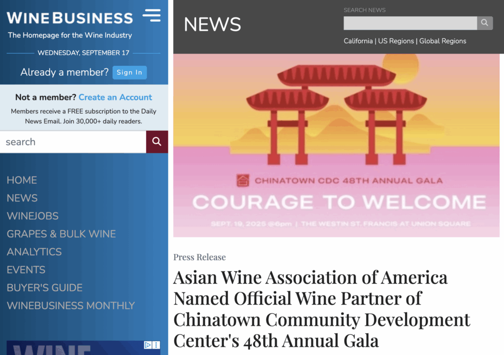 The Asian American Wine Association (AWAA) is proud to announce its partnership with Chinatown Community Development Center (Chinatown CDC) as the official Wine Partner for Chinatown CDC’s 48th Annual Gala, Courage to Welcome, taking place Friday, September 19, 2025.