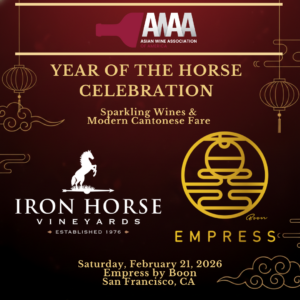 What better way to toast to the New Year than with the excitement of delicious sparkling wines? Welcome the Year of the Horse with AWAA Member Winery Iron Horse Vineyards at Empress by Boon in San Francisco’s historic Chinatown for a festive celebration with curated pairings of Iron Horse Vineyards’ acclaimed sparkling wines and the exquisite cuisine of Michelin-starred Chef Ho Chee Boon, led by AWAA President & Co-Founder Susan R Lin, Master of Wine, and Iron Horse Vineyards’ Partner/CEO Joy Sterling.